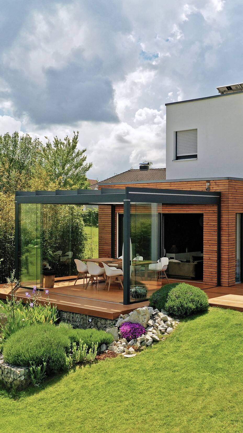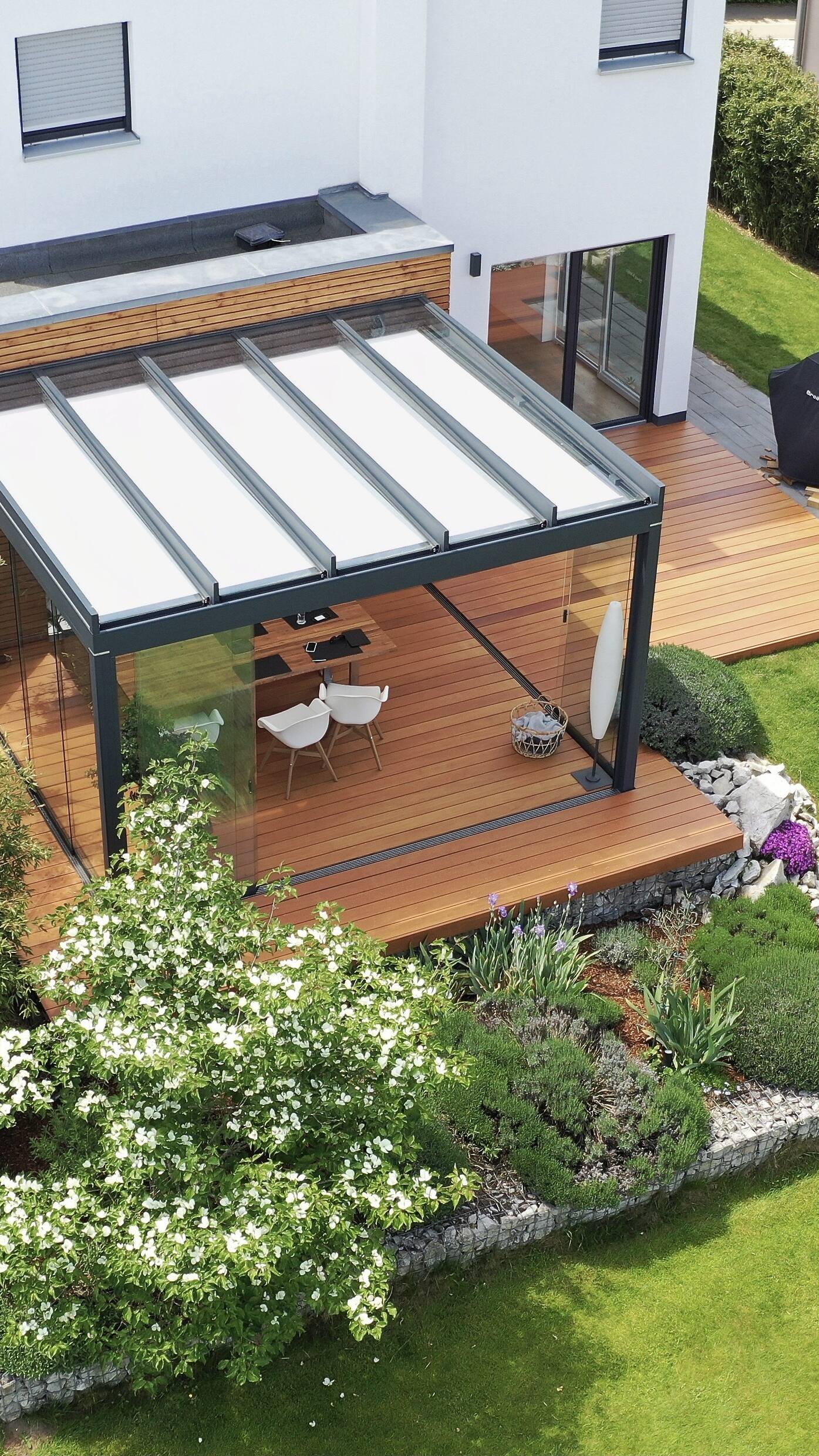 The Weinor Terrazza Pure offers a refined interpretation of this concept, combining a flat glazed roof with optional glass sides and sliding doors to create a stylish, sheltered space that feels open yet protected.